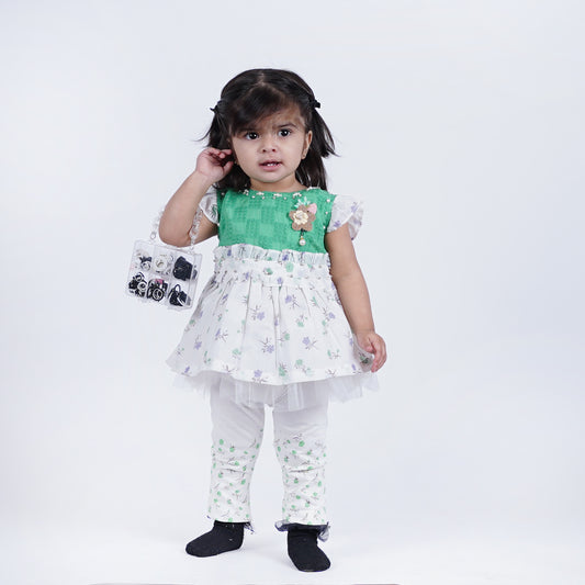 Girls Fancy Frock with Pants Flower Bunch Pink & Green