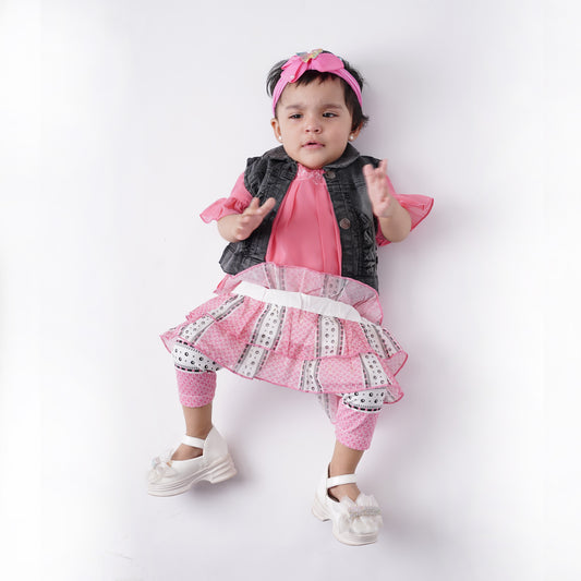 Girls Fancy 3pc Top with Chiffon Coat & Denim Jeans
