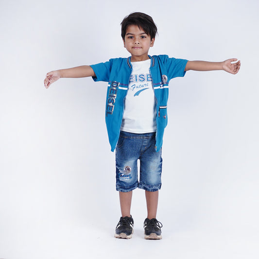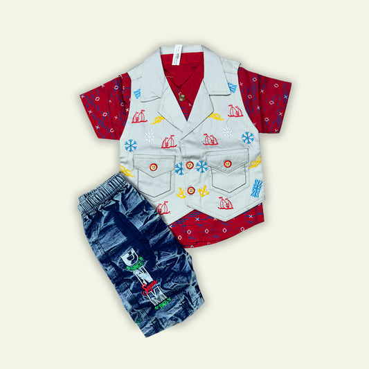 Boys Fancy 3pc Top coat style shirt with Denim Short